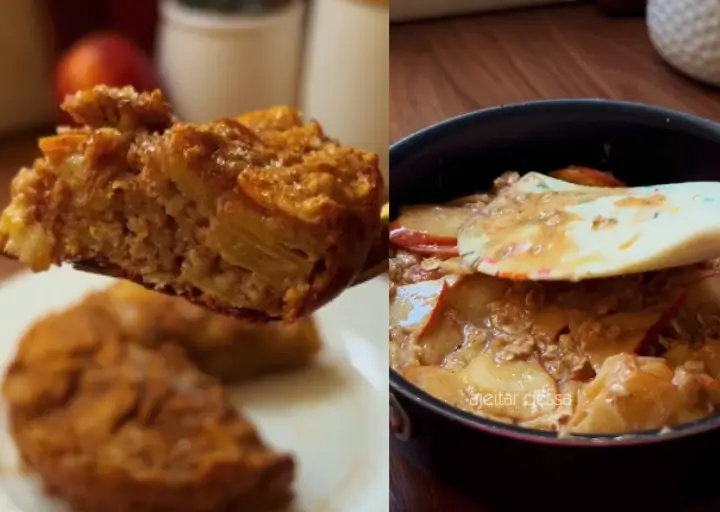 Feita com aveia, maçã ralada e adoçante natural, ela é uma daquelas receitas que parecem de padaria, só que com ingredientes de verdade, sem farinha branca nem açúcar refinado.